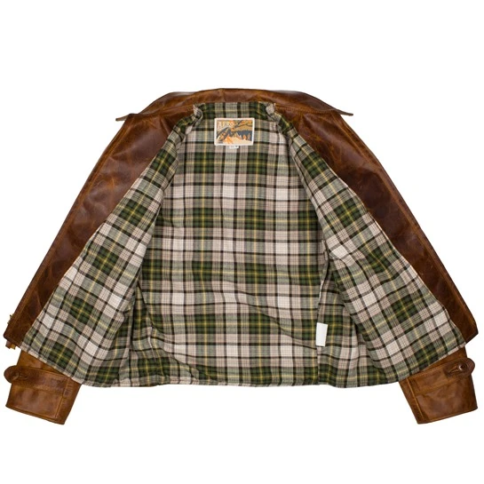 We’ve cut this jacket with a high, shallow yoke above a vertical bi-swing upper back while the classic false belt, side cinch adjusters and lower skirt panel are retained. The side pocket angle is less steep we’ve also dropped the breast pocket for a cleaner look. The sleeve has been slimmed down slightly and the cuff has an early style strap and button which can be adjusted for wind resistance and the jacket is lined in a lightweight cotton Tartan.