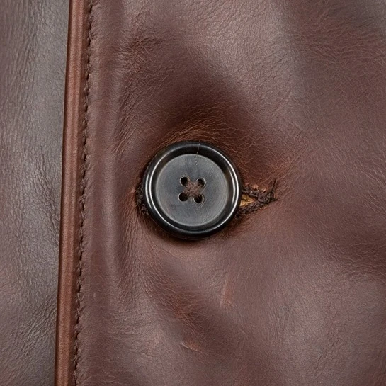 The Cheyenne is a single breasted leather coat, similar to the Barnstormer. This however has no belt, which makes it easier to wear. The front has four pockets : two sloping hand warmer/ map pockets and two cargo pockets. This version has four hand sewn buttons. The sleeves have early American styled cuffs similar to 1940’s styling. The back is made from three pieces of leather: a straight yoke (7 1/2″!) deep, with two large sections top stitched at seams for a wonderful feature stitch finish.