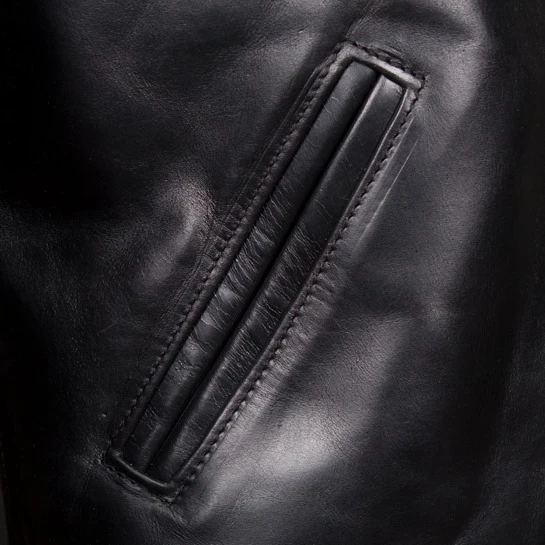 The front of this jacket has an extra button fastening tab at the neck for extra protection from the elements. The side pocket angle is fractionally different from our Half Belt and this version has no top pocket. The cuff on this “Cossack” has a button closure and is more typical of the 20’s and 30’s than the Half Belt/Highwayman style cuff more commonly found on 1950’s originals.