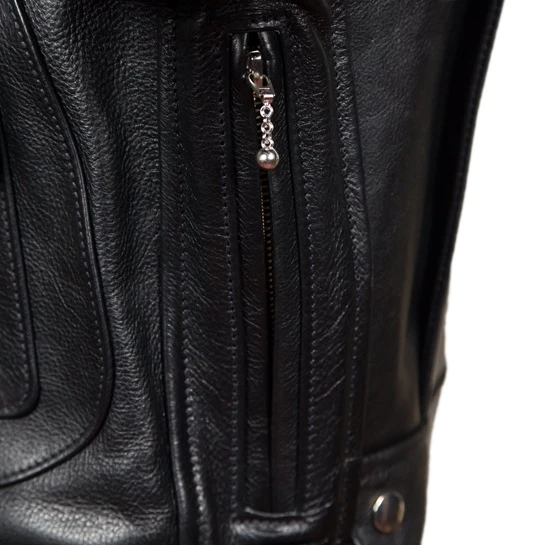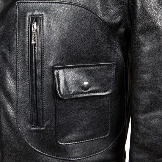 The left front features a sweeping D pocket with puller-zip, and curved patch pocket, while on the left-hand side we’ve fitted a zipped hand warmer pocket. The side panels had zip entry pillion passenger pockets, a feature of some of the finest jackets of the period where a zip opening in the side panel allowed a passenger to put their hands inside the riders jacket for security and warmth.