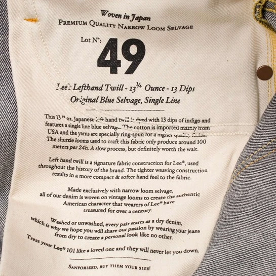 Henry David Lee set up the HD Lee Mercantile Co in Kansas, 1889 specialising in the production of denim dungarees, overalls and railroad jackets. In 1924 Lee released the 101B Cowboy jeans, the first denim trouser specifically designed for cowboys and rodeo riders. Historically, this 101B is one of the later models replicating the iconic fit from 1946 cut primarily with the cowboy in mind. These have wider set back pockets give riding comfort and the wide cut straight leg tapers down at the hem and cut from14oz Selvedge Denim woven in Japan using American Cotton. The jeans themselves are made in Italy Lee was usually the choice of denim amongst many iconic figures including James Dean, Clark Gable and Marilyn Monroe.