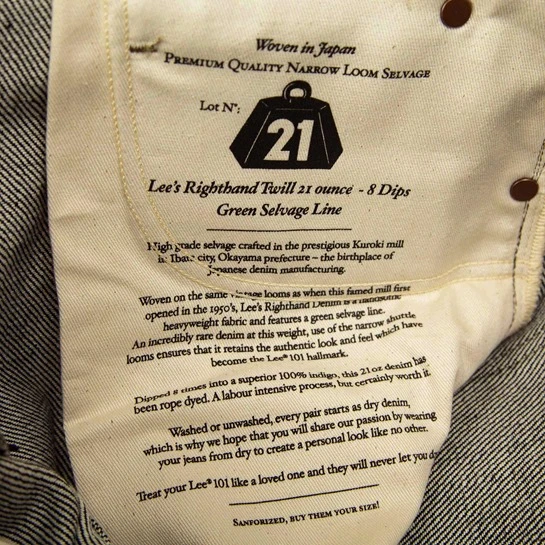 This seasonal 101 Z, the relaxed fit premium Lee Jeans is delivered in a 21oz Heavyweight Rigid Japanese Selvedge Denim from Kuroki, Japan. It is woven on authentic narrow looms, is rope dyed, went through 8 dips and comes with a beautiful dark green full selvege finish.