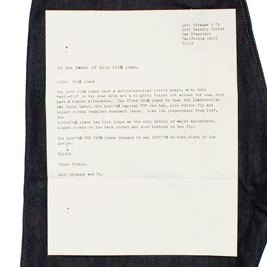 The Levi’s® Vintage Clothing 1955 501® Jean represents classic 1950s biker style. These jeans had an “anti-fit” in the seat, a slightly fuller cut around the leg, and a boxier silhouette. It was also the first to bear Levi’s® leather-like, paper Two-Horse Pull patch. Additionally, the updated red tab is double-sided— another example of Levi’s® meticulous attention to detail. This version of the 501® still retains some classic features of its 1947 predecessor: belt loops as the only method of waist adjustment, hidden copper rivets on the back pockets, and a zinc button fly. It is made with selvedge denim from Cone Mills of North Carolina—a Levi’s® brand partner for over 100 years.