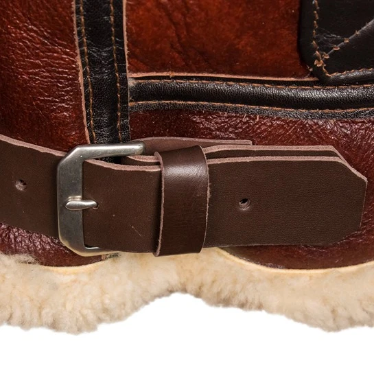 Aero Leather Clothing 42-5110-P uses the correct B-3 weight heavy Shearling Sheepskin with extra strong Horsehide sleeve and seam overlays for extra protection, single map pocket on the right hand side and heavy leather straps with 3-way stud collar closure for use in foul weather to enable the jacket to provide added protection to the lower part of the face. We use a Triple Marked Talon zipper on wide herringbone tape, Alloy buckles recast from originals and a label identical to the WW2 label.