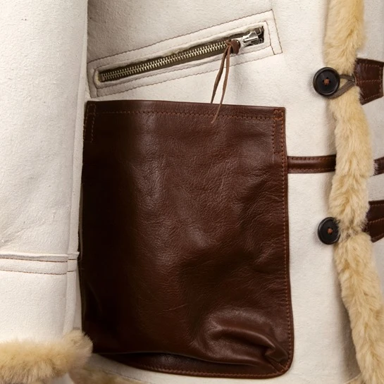 The Type B-7 Arctic Parka was originally designed for flight crews and ground personnel based in extreme cold and remote locations during World War II. The B-7 Flight Parka is a mid-thigh length jacket that features trimmed hood with drawstrings for protection against the bitter winds and blowing snowstorms. There are two deep open-top front map/cargo pockets which arte perfect for keeping gloves handy , and two additional front zippered pockets with leather reinforcements at key stress points. There are toggle buttons alongside the covered zipper, storm cuffs, leather rank tabs at the shoulder . This jacket is available in Seal Brown, “Redskin” or Natural Sheepskin.