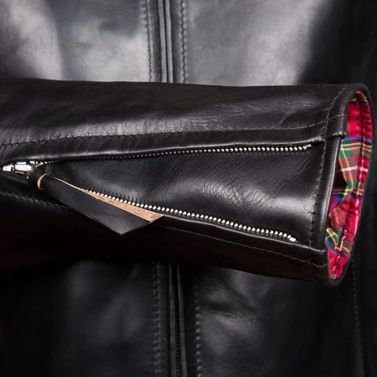 The back has a two-panel construction: upper sloping/V shaped yoke, large lower panel and an approximate 2″ waistband. The sleeves also have brass zips for closure. The whole of the jacket is lined in our heavy duty cotton drill, which should add to its longevity.